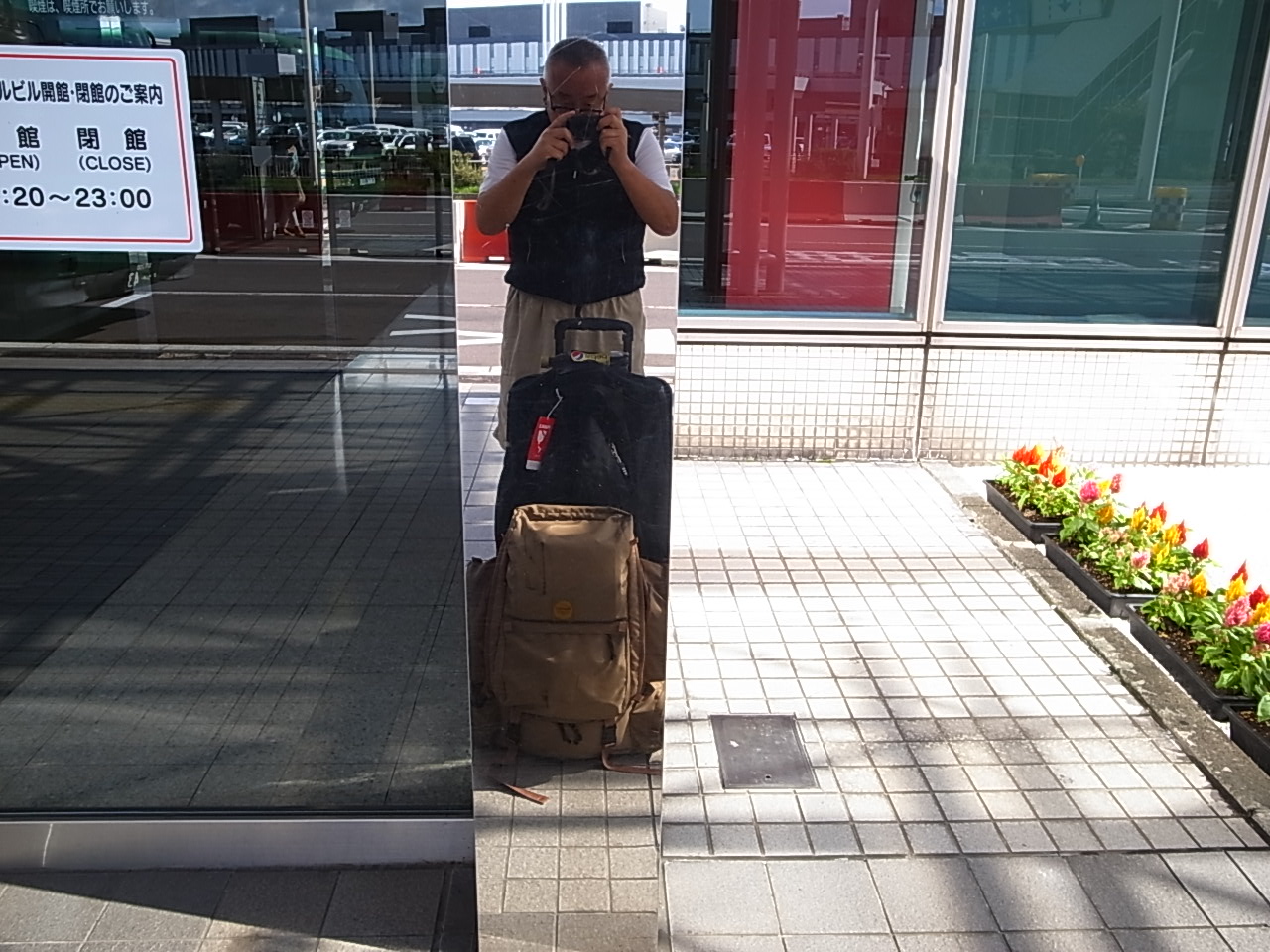 自分を撮ろうと思ってもなかなか無い。出入り口の柱が鏡張りに。情けない姿ですが荷物&私であります。東京が暑いので短パンで来てしまいました。