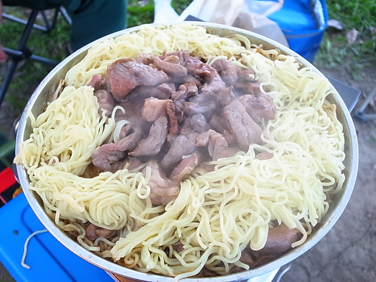 ファイヤーマンの職場での食べ方。麺を回りに置き焼くというより煮る。なので漬けジンギスカン向きか。1日目はラーメン用の麺で行ったが芯がなかなか消えない。2日目は焼きそば用麺で行ったらバッチリ。ご家庭でチャレンジ願いたい。