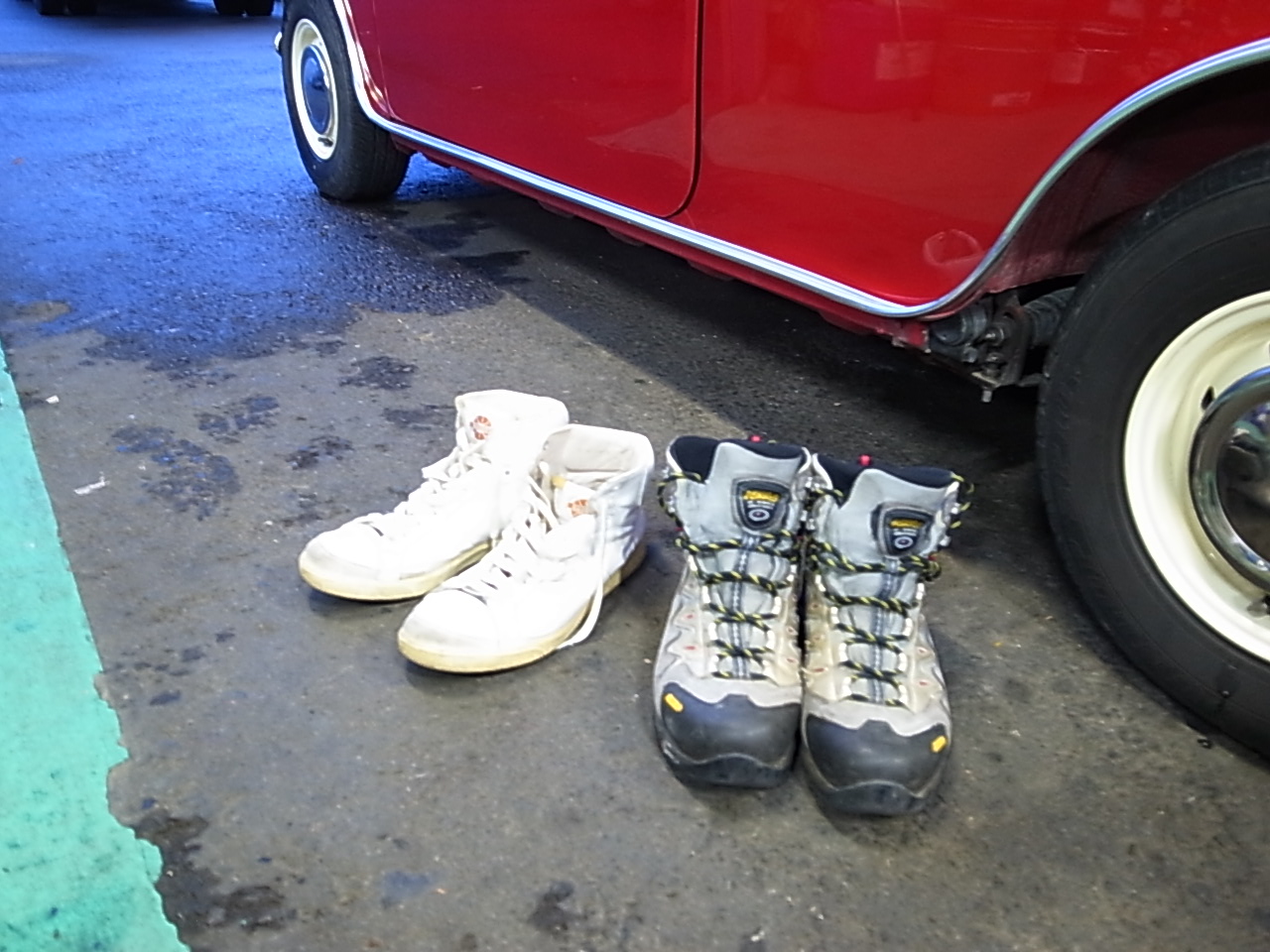 リュックに入れてきたミニ用の靴に履き替えます。ランドローバー用では運転できません。細かなアクセルワークとソフトなクラッチワークが必要なんですミニは。