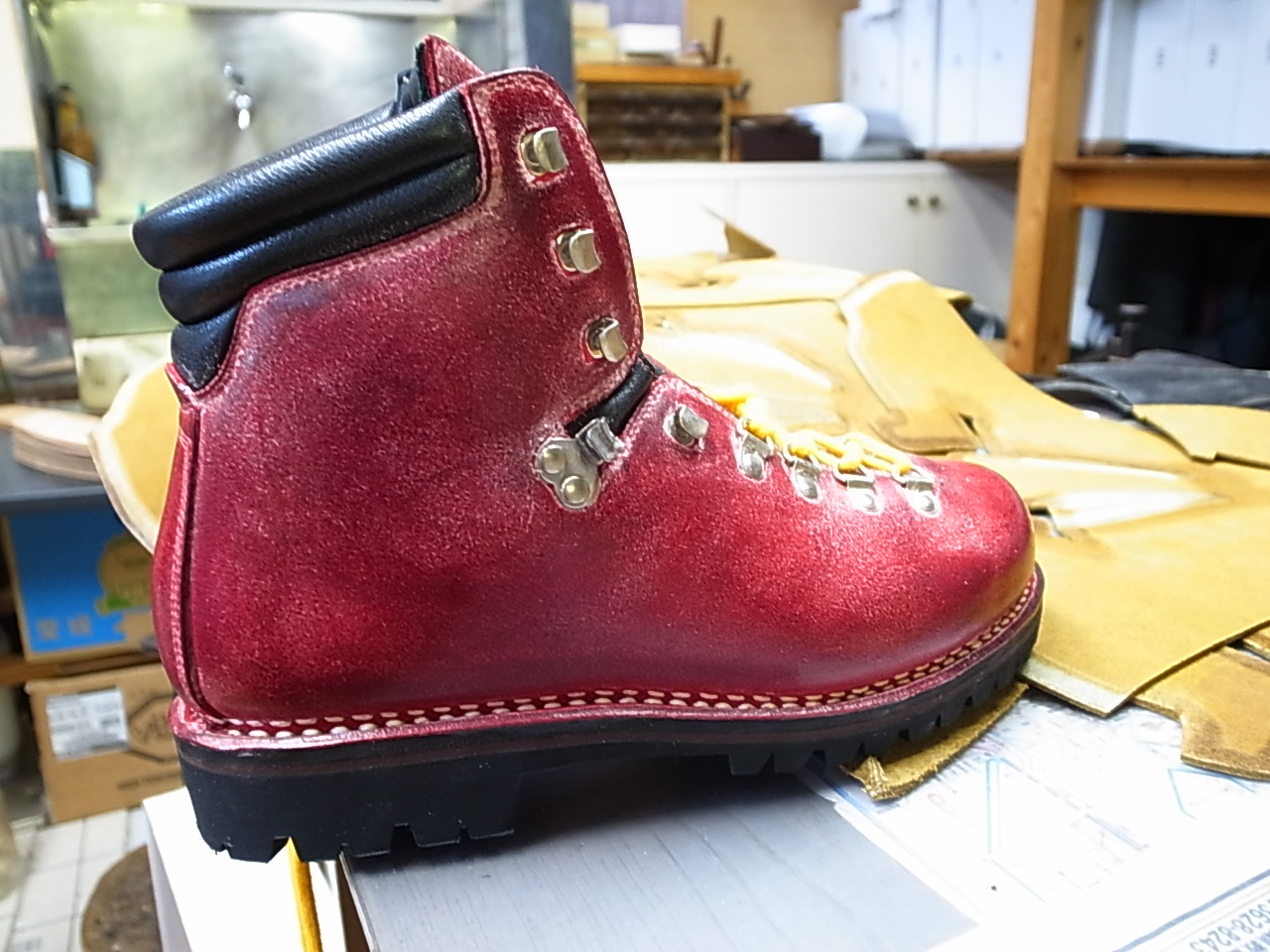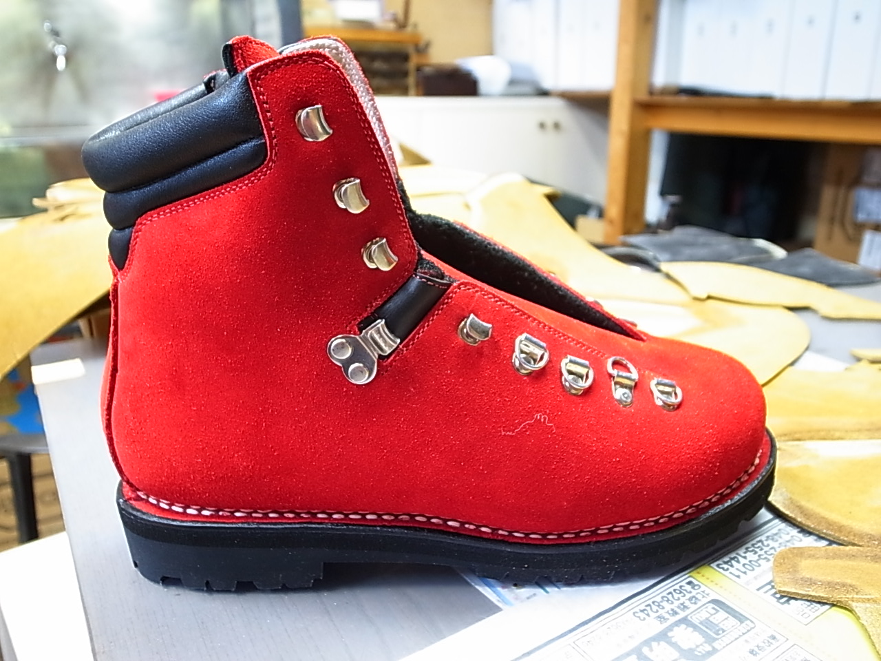 紐の縛り方を忘れないように電車のホームで記念撮影。もう二度とこの赤色は見られません。しかし歩きやすい。買って履いて帰ってきましたから。靴の中には敷物は入れるなとお父さんの一言が。紐の縛り練習まで致しました。半年履いて何も問題無ければ同じ靴を買います。靴は休ませる時間も必要。二足を交互に履くのが理想なのです。中山製靴は私に感動を与えてくれました。オーダーでも作ってくれます。しかしサイズが有れば私のように履いて帰れます。でも通販で買うよりお父さんに足形をとってもらいサイズを選んでもらうのが正しい購入方法かと私は思います。最近は軽量登山靴が流行でなかなか売れないと話してました。でも間違い無い手作り靴職人でありました。私が毎月同じ靴を買うのもシンドイので、ご興味の有る方は手間と愛情が必要になりますが一足いかがでしょうか。私とお揃いで歩きませんか。まだちょっと興奮している私なのであります。