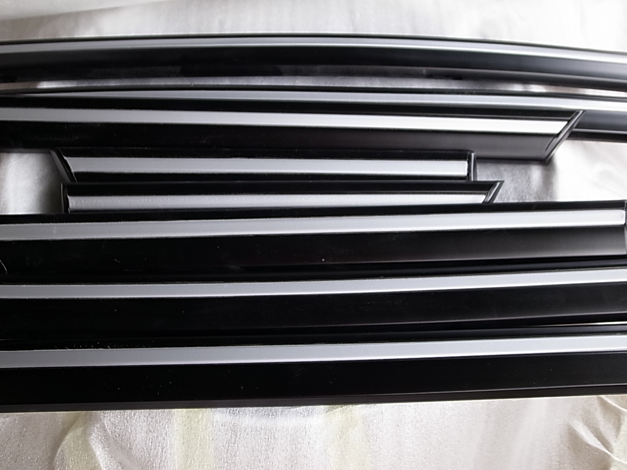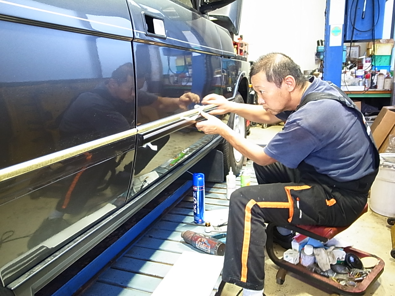 何が大変かと言うとサイドモールを取り外した後処理が大変。接着剤がボディに張り付き取れません。この接着剤を取り除かなければリフレッシュモールが剥がれてしまいます。結果として平島君は2日間掛けて接着剤剥がし。私も手伝いましたがボディに傷を付けないようにと気を使います。全塗装でしたら接着剤も磨いて取れますが、全てのクルマが全塗装とは限らない。無事にリフレッシュしたサイドモールを取り付け完了時には一筋の涙が・・・。ちょっとオーバーか。その位の手間で有りました。